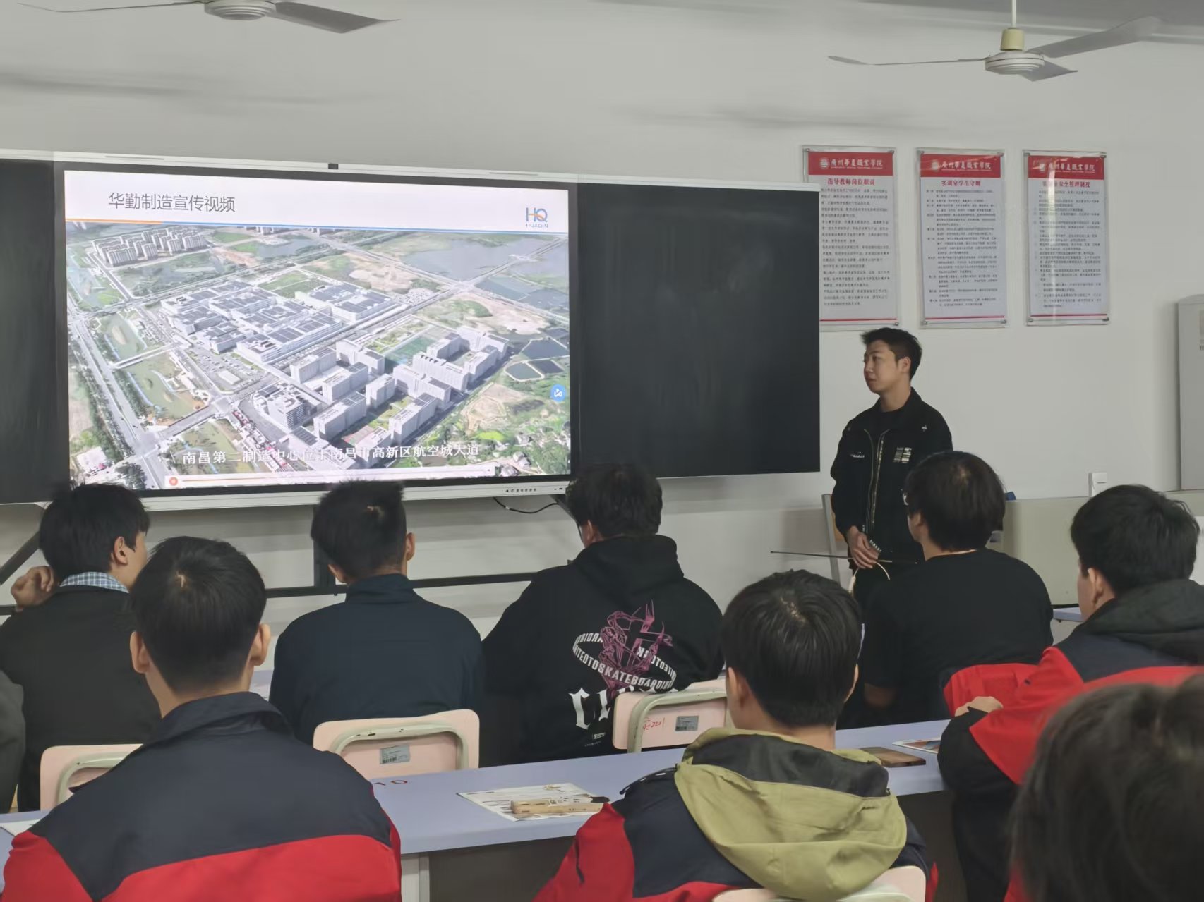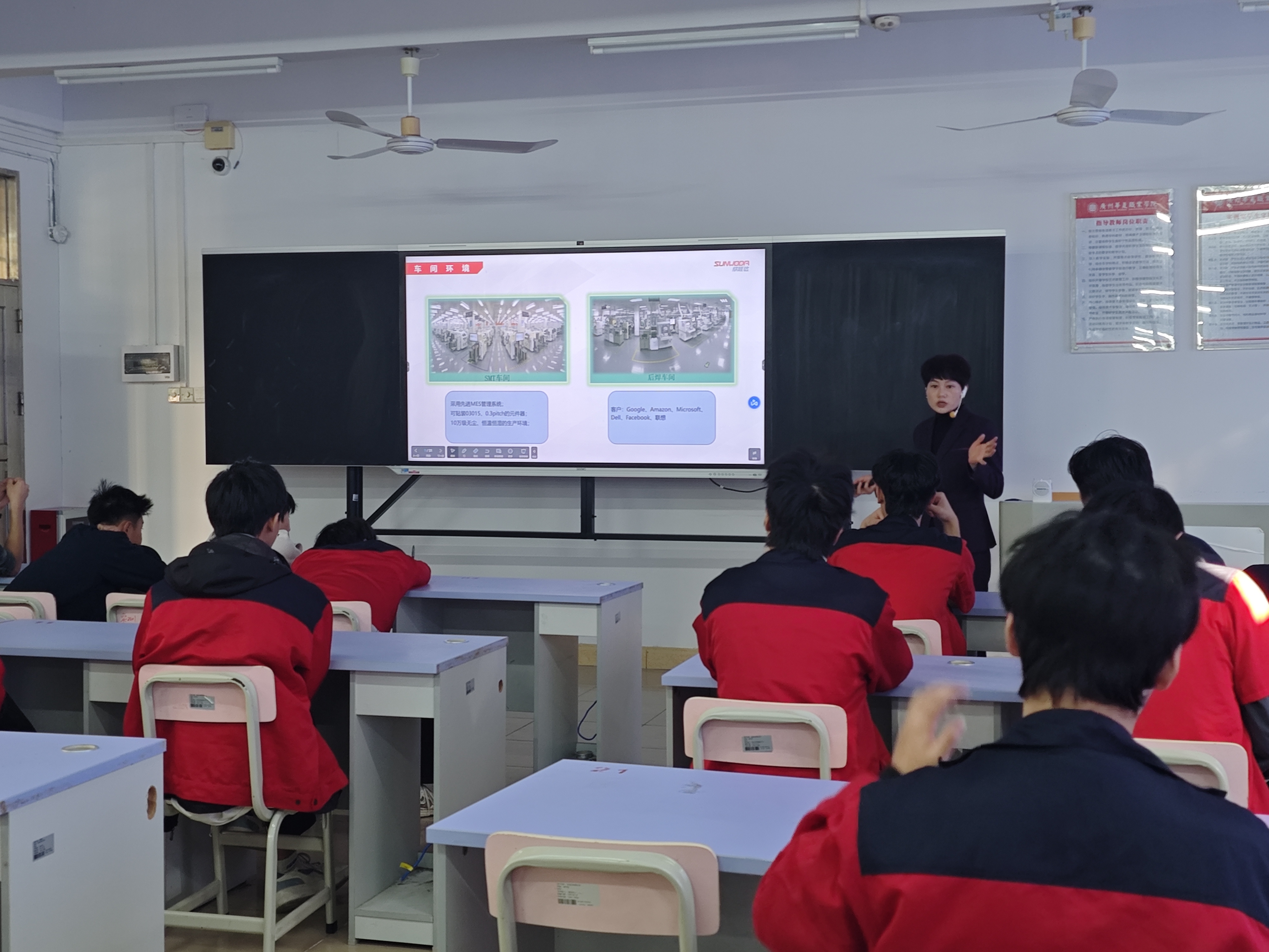 随后,华勤技术股份有限公司的郭家豪经理为同学们带来了生动讲解。华勤技术是全球智能硬件平台的龙头企业,总部位于东莞,业务覆盖广泛。郭经理从智能硬件产品的创新制造切入,展示了公司的强大研发设计与全球供应链能力。他特别介绍了公司对生产技工、技术员、品质工程师等一线技术类岗位的旺盛需求,以及为员工提供的技能成长环境和福利保障,表达了与华夏高级技工学校深入合作、共同培养实战型技能人才的强烈意愿。
